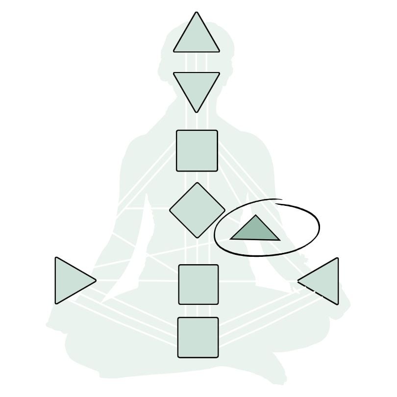 Heute beschäftigen wir uns mit dem definierten Herzzentrum. Das Herzzentrum, auch Egozentrum genannt, ist das kleine Dreieck rechts in der Mitte. Wenn es bei dir definiert ist, dann ist es wie im Beispiel oben farbig dargestellt.